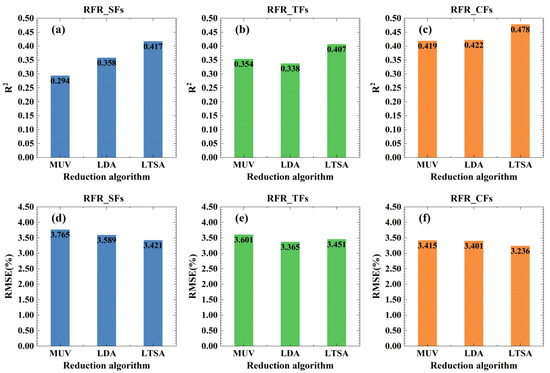 RFR-SFs, RFR-TFs, and RFR-CFs model evaluation indicators based on three dimensional reduction algorithms: (a,d) R2 and RMSE of RFR-SFs model; (b,e) RFR-TFs R2 and RMSE of the model; (c,f) R2 and RMSE of the RFR-CFs model.