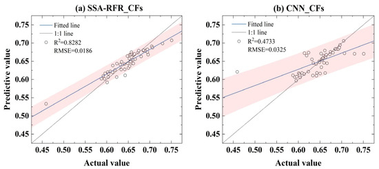 Taking the CFs as an independent variable, a Convolutional Neural Networks (CNN) model for estimating the water content of A. sinensis was established and compared with the SSA-RFR_CFs model constructed in this study. Figure 8a,b shows the estimation results of the SSA-RFR_CFs and CNN_CFs models, respectively, where the R2 and RMSE of the SSA-RFR_CFs model were 0.8282 and 0.0186, respectively, and the R2 and RMSE of the CNN_CFs model were 0.4733 and 0.0325, respectively. The R2 of SSA-RFR_CFS was 75% higher than that of CNN_CFs, while the RMSE was 47% lower. At the same time, within the 95% prediction band, the estimated value of SSA-RFR_CFs was more evenly distributed on both sides of the 1:1 line, and the difference between the estimated and measured values was smaller. It could be seen from the above analysis that compared with CNN, the SSA-RFR model proposed in this study had a better fitting effect and higher prediction accuracy.