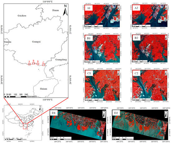 Schematic diagram of the location of the study area; (A1) high tide level image of study area A on 9 November 2019; (A2) low tide level image of study area A on 28 September 2019; (B1) high tide level image of study area B on 9 November 2019; (B2) low tide level image of study area B on 28 September 2019; (C1) high tide level image of study area C on 20 September 2019; (C2) low tide level image of study area C on 30 September 2019; (D1) high tide level image of study area D on 7 December 2020; (D2) low tide level image of study area D on 27 June 2020.