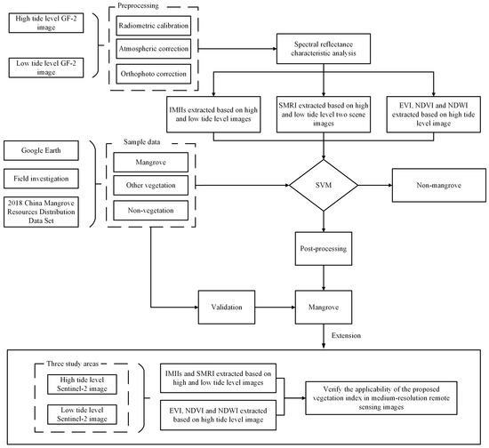 In order to accurately extract the spatial distribution of mangrove trees under tidal inundation, in this study, the IMIIs and other commonly used vegetation indices were extracted based on the high and low tide level GF-2 images, respectively, which are used to extract the mangrove spatial distribution under tidal inundation, and it serves to verify the application potential of the IMIIs for the extraction of the spatial distribution of mangroves through comparative research. In addition, the above vegetation indices were tested on Sentinel-2 images of three different regions in order to further verify the applicability of the vegetation index based on high-resolution images in the case of medium-resolution remote sensing images, with the aim of achieving the accurate extraction of the spatial distribution of mangroves under tidal inundation from both the medium and high-resolution images at the same time. The technical flow chart used in the study is shown in Figure 2.