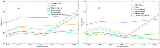 Spectral reflectance curve of different land cover types based on GF-2 images at different tide levels: (A) Low tide level; (B) High tide level.