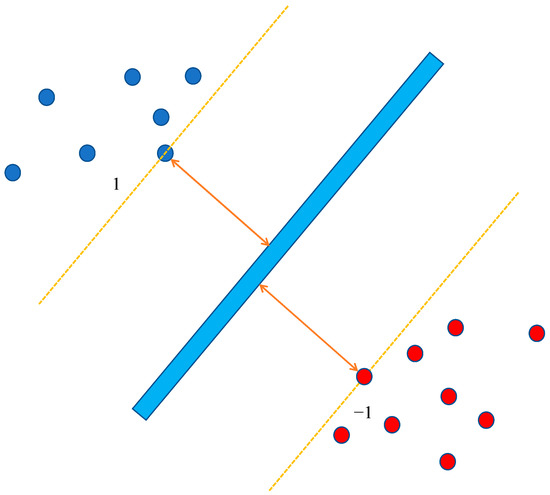 In this paper, support vector machine (SVM) algorithm was employed to extract the spatial distribution of mangroves. To study the differences in the extraction results of spatial distribution of submerged mangroves using different vegetation indices, each of the vegetation indices was first used as input variable for SVM algorithm. Then, on the basis of the single variable extraction results, multiple variables were synergistically applied to improve the accuracy of the spatial distribution extraction results of submerged mangroves. SVM is a variety of generalized linear classifier that classifies data in a binary way according to supervised learning. The decision boundary was determined by the maximum margin hyperplane to solve the learning sample [34,35,36], as shown in Figure 4.