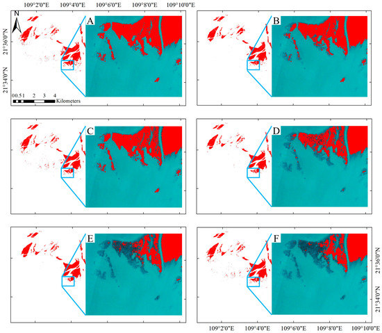 Results of mangroves spatial distribution extraction with different vegetation indices based on Sentinel-2 images in study area B: (A) IMII1; (B) IMII2; (C) SMRI; (D) EVI; (E) NDVI; (F) NDWI.