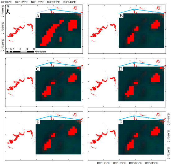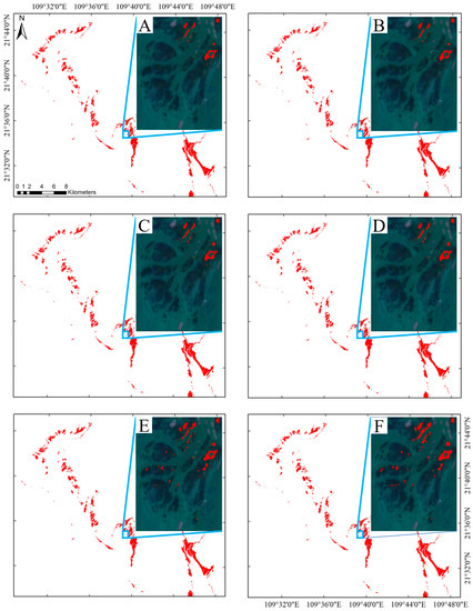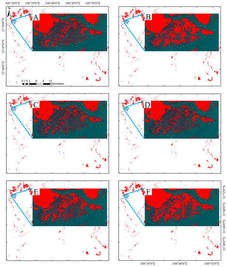 Results of mangroves spatial distribution extraction with different vegetation indices based on Sentinel-2 images in study area C: (A) IMII1; (B) IMII2; (C) SMRI; (D) EVI; (E) NDVI; (F) NDWI.