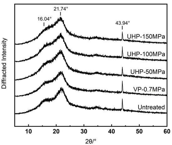 The XRD patterns of the untreated, vacuum-pressurized and UHP-impregnated bamboo slices are shown in Figure 1. Three crystal peaks were observed at approximately 16.04, 21.74, and 43.94°. There were no changes in the position and height of the crystalline peaks compared to those of the untreated bamboo slices. The results showed that the different pressures did not affect the crystal structure of bamboo cellulose.