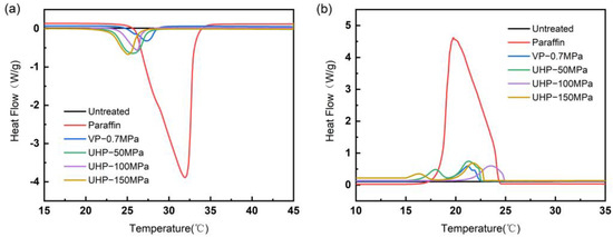 This indicates that bamboo does not affect phase-change energy storage. The latent heat of the phase change of the modified bamboo was much lower than that of paraffin, which was mainly related to the amount of impregnated paraffin [38]. The properties of the paraffin changed during the UHP treatment. There were two convex peaks when the latent heat of freezing of the bamboo slices was measured. The smaller peak is the freeze–freeze phase transition peak, the larger peak is the freeze–melt phase transition peak and the actual latent heat of the phase change of the bamboo slices is the sum of the two peak areas [39]. Under different pressure conditions, the latent heat of the phase transition first decreased and then increased, indicating that the amount of impregnated paraffin was affected by the pressure impregnation and relief process. The paraffin content and the latent heat were higher in the UHP impregnation treatment than in the vacuum pressurization treatment. At 50 MPa, the weight gain and the impregnation of paraffin were the highest. Pressure mainly increases the impregnation of paraffin and does not affect the crystallinity of cellulose, and the latent heat of the bamboo slices is the highest at 50MPa. The melting temperature of paraffin is 25.76 °C, and the latent heat of melting is 24.66 J/g; the freezing temperature is 21.69 °C, and the freezing latent heat is 24.34 J/g. At 100 MPa, paraffin impregnation is reduced in the pressure-relief process of the equipment. The fiber cells were compressed and partially fractured, and the destructive effect of pressure on the fiber cells was greater while the amount of impregnated paraffin decreased, resulting in a reduction in both the crystallinity and latent heat of the cellulose of the bamboo slices. At 150 MPa, due to the high pressure, some of the paraffin could enter the bamboo cells, and the impregnation amount increased. The latent heat of the bamboo slices increased, while the compression force on the fiber cells was elevated, the arrangement was tighter and the crystallinity of the cellulose increased [40].