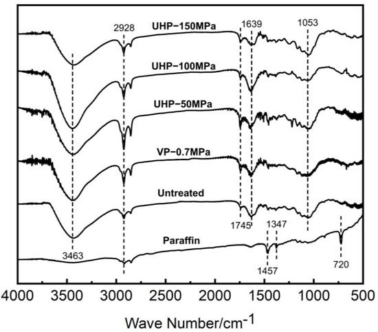 Figure 3 shows the infrared spectra of the paraffin, untreated bamboo, and vacuum-pressurized and UHP-impregnated bamboo slices. The peak at approximately 3463 cm−1 is the hydroxyl group absorption peak of hemicellulose, cellulose and lignin [41]. At 150 MPa, the height of this peak decreased significantly because the paraffin entered the interior of the cells, thereby reducing the hydrophilicity of the bamboo slices. The peak at approximately 2928 cm−1 is the absorption peak for the aromatic methyl and methylene stretching vibrations and paraffinic hydrocarbons [42]. The main component of paraffin is a mixture of a range of common alkanes; therefore, an absorption peak appears at this position [43,44]. In addition, the asymmetric deformation vibrations of paraffin methylene absorption peaks [45] are near 1457 cm−1 and 1347 cm−1, and the in-plane wobble vibration peak of paraffin methylene [46] is near 720 cm−1. The absorption peaks at approximately 1745 cm−1 and 1639 cm−1 are the non-conjugated carbonyl group stretching vibration and aromatic skeleton vibration [47], respectively, and the peak at approximately 1053 cm−1 is the ether link stretching vibration absorption peak in the amorphous region of cellulose [48]. The heights of the three peaks decreased, indicating that the hemicellulose content was reduced under the UHP. The modified bamboo slices combined the characteristic absorption peaks of bamboo and paraffin, and the absorption peaks mostly overlapped. No new absorption peaks were observed in the spectrum, further indicating that the modified bamboo slices did not generate new groups. Paraffin and bamboo are primarily formed by intermolecular forces. The intensity of each characteristic peak under different pressures showed little difference, indicating that pressure had little effect on the chemical composition of the bamboo slices.