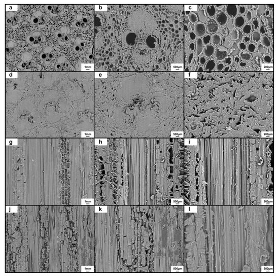 Figure 4 shows the SEM microstructures of the cross- and radial sections of bamboo slices after treatment with 150 MPa, the impregnation temperature is 70 °C and the time is 10 min. The internal cell structures of bamboo slices after UHP impregnation with paraffin wax were observed at the levels of 1 mm, 500 μm and 200 μm at 60, 200 and 500 times magnification respectively. Figure 4a–c and Figure 4g–i are the cell structure of untreated bamboo, while Figure 4d–f and Figure 4j–l are the cell structure of UHP-impregnated paraffin-treated bamboo. Figure 4a–f are the cell structure of the cross-section of bamboo, and Figure 4g–l are the cell structure of the radial section of bamboo.