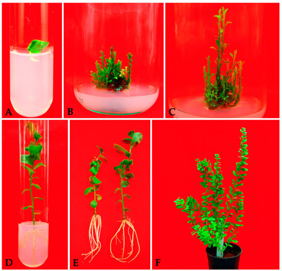 In vitro micropropagation of Maerua crassifolia. (A) An example of the hypocotyls (explants) that were cultured on solid MS medium supplemented with 0.7% agar and 3% sucrose with different combinations of cytokinins (BA or Kin) at various concentrations (2.5, 5.0, 7.5, and 10 µm) either alone or in combination with auxins (IBA or NAA) with different concentrations (0.1, 0.5, 1.0, and 2.0 µM) after 1 week of cultivation. (B) Explants cultivated on MS medium with 7.5 µM BA after 8 weeks of cultivation. Explants were regularly subcultured on the same designated fresh medium every 3 weeks to promote shoot growth. (C) Explants cultivated on MS media with 7.5 µM of BA and 1.0 µM of IBA after 8 weeks of cultivation. (D) Plantlets rooted on ½ MS medium containing 1.0 µM of IBA after 8 weeks of cultivation. (E) Rooted plants before transplantation. (F) A well-established micropropagated plant of M. crassifolia showing normal growth after 3–4 months of acclimatization.