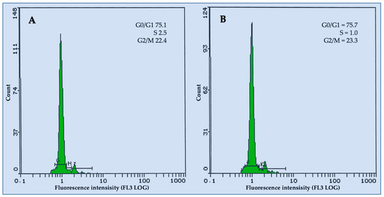 Typical FCM histograms of Maerua crassifolia. (A) From leaf samples of in vitro propagated plants; (B) from leaf samples of the donor plants.
