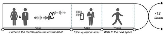 During the sensory-walking experiment, the participants were not allowed to speak, eat or drink to reduce human noise. Finally, they walked through each designated sensory walking area along a specified route. The group stopped at each site for five minutes, standing or sitting while carefully listening to sound elements and feeling the thermal environment, then filled out a questionnaire online. The experimental process is shown in Figure 2. The primary leader was also responsible for using equipment to collect data, including temperature, global temperature, humidity, wind speed, and the LAeq (a weighted equivalent continuous sound level), for a continuous period of 5 min [64].