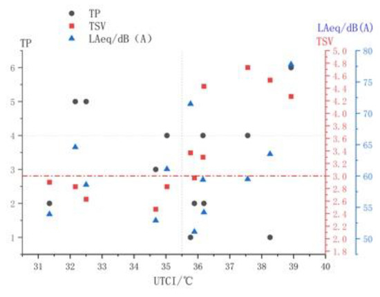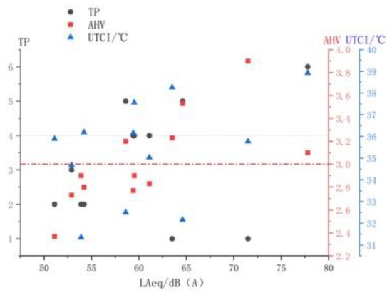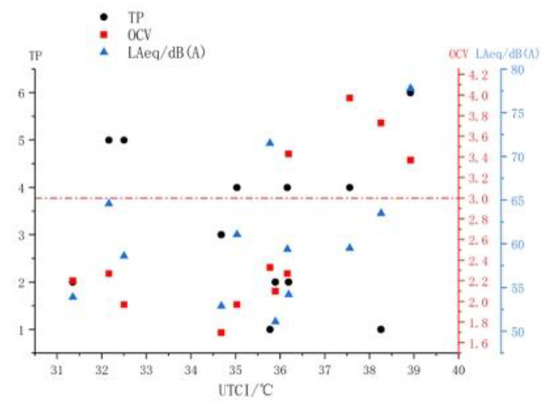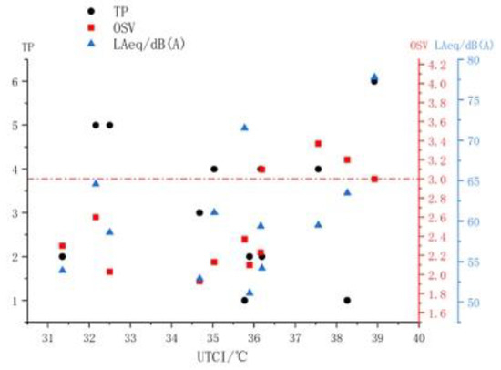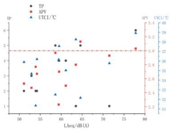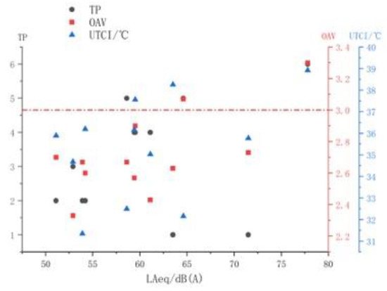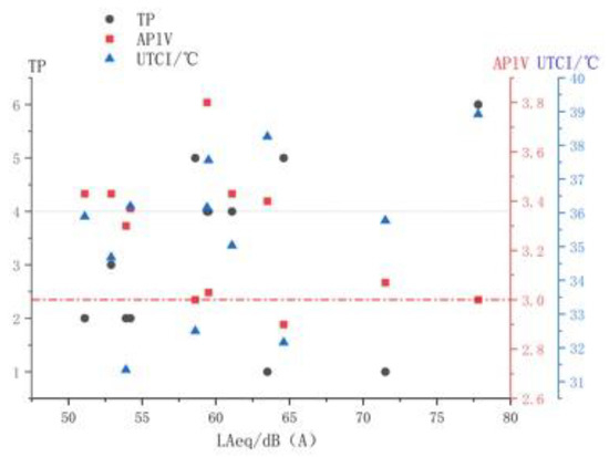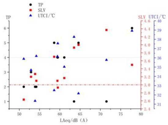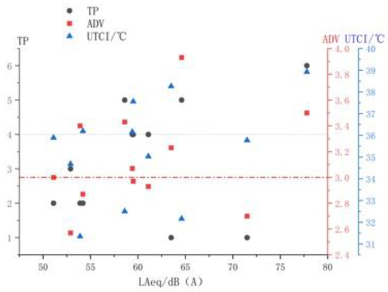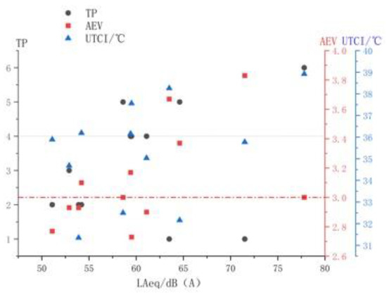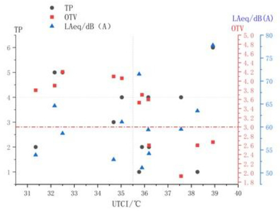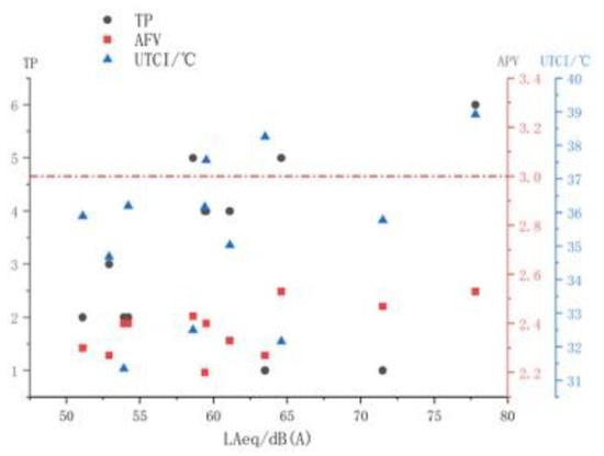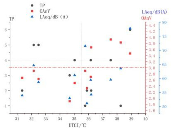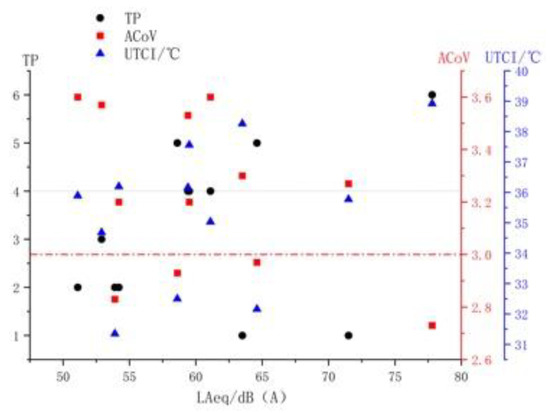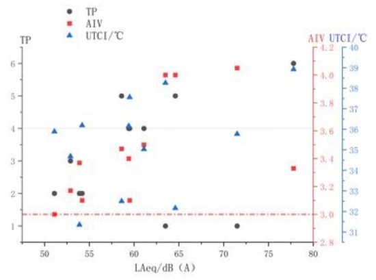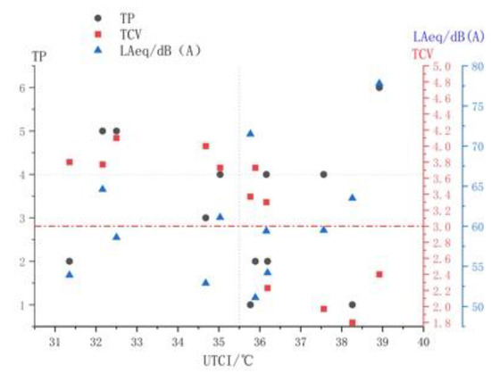 Figure 5 illustrates the TAV values of 12 sample sites. Regarding the impact of the thermal environment on TAV, there is a significant decrease in TAV with the increase of UTCI. When the UTCI value is below 36, the TAV score is higher, while the degree of thermal comfort significantly reduces when the UTCI value exceeds 36. As for the impact of the acoustic environment on TAV, LAeq and TP have no significant influence on TAV as a whole.