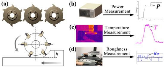 (a) Cutting tools and up-milling, (b) cutting power measurement, (c) temperature measurement, and (d) surface roughness measurement.