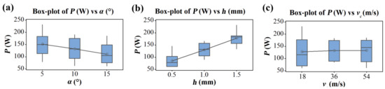 Figure 3 shows the results of Pareto analysis of the cutting power, with a significance level of 5 percent (α = 0.05). This chart can display the significance of each cutting variable affecting the experimental result. When the value of a cutting variable exceeds the red reference line, it can be considered a significant variable; otherwise, it is insignificant. Therefore, the variables of cutting depth (h) and rake angle (α) both have significant contributions to cutting power, while the cutting speed (vc) has an insignificant influence on cutting power. This result is consistent with the cutting power during the milling process of wood–plastic composite [27]. According to a related work, different cutting parameters have interactive effects on the cutting power [8]. Based on interaction analysis of cutting power, as shown in Figure 3, only the interaction of cutting speed and depth (vc × h) has a significant contribution to the cutting power, while the interactions of rake angle and cutting depth (α × h) and rake angle and cutting speed (α × vc) have insignificant effects on the power. Table 4 displays the factor analysis results of cutting power. The delta value of a cutting variable indicates the degree of influence on the cutting power. A higher delta value of a cutting variable indicates that this cutting variable has a greater contribution to cutting power. In these experiments, the delta value of cutting depth (h) is equal to 93.04, which is higher than those of rake angle (α, 41.04) and cutting speed (vc, 5.15). Therefore, cutting depth has the greatest impact on the cutting power, followed by rake angle and cutting speed.