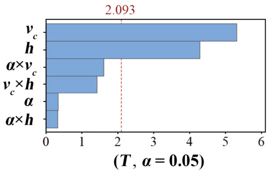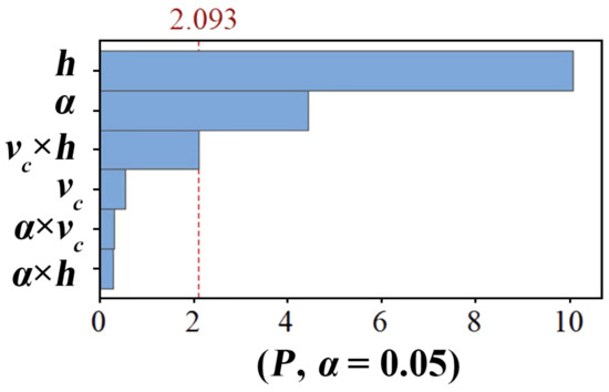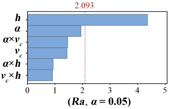 Figure 7 displays the Pareto results for surface roughness with a significance level of 5 percent (α = 0.05). It shows how significantly the different cutting variables affected the surface roughness. Only the cutting speed exceeds the reference line, indicating that only the cutting depth (h) makes a significant contribution to the surface roughness. Surface roughness is insignificantly affected by both the rake angle (α) and the cutting speed (vc). Surface roughness is an important parameter that represents the quality of a machined surface. It is influenced by factors such as workpiece material, cutting parameters, and tool geometry [30,31,32]. However, as given in Figure 7, none of the values for the interactions of rake angle and cutting speed (α × vc), cutting speed and depth (vc × h), and rake angle and cutting depth (α × h) exceed the red reference line. Therefore, these interactions have insignificant impacts on surface roughness. Furthermore, according to the delta values of the cutting variables listed in Table 6, the delta value of cutting depth is equal to 1.56. This is larger than those of rake angle (0.69) and cutting speed (0.52). Therefore, it can be concluded that the cutting depth has the greatest contribution to surface roughness, followed by rake angle and cutting speed.