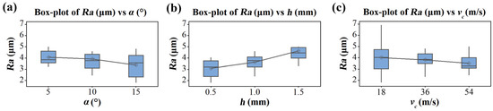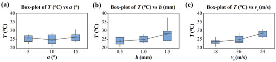 Cutting temperature is generated from the plastic deformation of the cutting zone and the friction between tool and workpiece. Figure 4a shows the cutting temperature at different rake angles analysed via Minitab. As rake angle increases, cutting temperature first decreases, and then increases. With the first increase in rake angle, a reduction in cutting resistance inhibits the generation of cutting heat. However, as the rake angle of the cutter increases further, greater friction is generated between the chip and rake surfaces, which intensifies heat generation, resulting in an increase in cutting temperature. Meanwhile, as shown in Figure 4b, the cutting temperature shows an increasing trend with increased cutting depth. This phenomenon is consistent with the cutting temperature in the sawing of hem-fir wood [28]. The increasing cutting depth removes a greater quantity of material, which is needed for higher throughput cutting work. This kind of cutting work produces a greater amount of cutting heat, thereby leading to a higher cutting temperature. Finally, Figure 4c shows the relationship between temperature and cutting speed. Note that the cutting temperature increases as the cutting speed increases. The higher cutting speed results in a greater frequency of friction events at both the rake face–chip interface and the flake face–machined surface interface. This leads to a higher cutting temperature. Thus, the cutting temperature is positively correlated with the cutting speed.