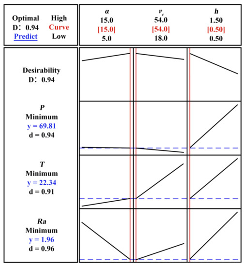In the industrial machining of beech, optimal power consumption, tool wear, and final quality are three key indexes relevant to enterprise benefits and product quality [33,34,35,36]. Thus, to improve cutting quality and reduce the energy consumption of the machine tool, a multi-objective optimisation was carried out. Surface roughness directly affects the surface quality of the final product, and this was taken as the first optimisation priority. Cutting power was selected as the second optimisation priority, as it only impacts the machine tool’s energy consumption. In this application, the overall cutting temperature is low and, thus, has limited impact on tool wear. Therefore, cutting temperature was selected as the third optimisation priority. As given in Figure 8, the ranges of cutting variables were set as follows: 5° < rake angle (α) < 15°; 18 m/s < cutting speed (vc) < 54 m/s; 0.5 mm < cutting depth (h) < 1.50 mm. The optimised prediction results were as follows: (1) The increase in rake angle led to decreasing responses for both cutting power and surface roughness and an increasing response for cutting temperature, so 15° was selected as the optimised rake angle. (2) The increase in cutting speed resulted in a decreasing response for cutting power and increasing responses for cutting power and temperature, so 54 m/s was adopted as the optimised cutting speed. (3) The increase in cutting depth increased the responses of cutting power, temperature, and surface roughness, so 0.5 mm was adopted as the optimised cutting depth. Together, the optimal combination of cutting parameters was determined to be a rake angle of 15°, cutting speed of 54 m/s, and depth of 0.5 mm.