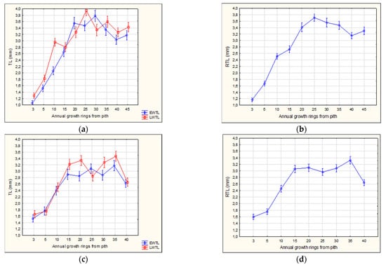 The annual growth ring-by-zone interaction was highly significant for EWTL and LWTL in wood from all three sites (Table 3). Zones included the earlywood and latewood separately, as presented in Figure 1a,c,e. However, the effect of annual growth rings (age) and trees was tested on the tracheid length of the annual growth ring (RTL).