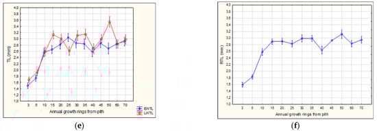 At the Veliki Grđevac site, EWTL rapidly increased from the third to the 30th annual growth ring, decreased until the 40th, and increased again until the 45th (Figure 1a). At the Poreč site, EWTL increased until the 15th annual growth ring, and then fluctuated until the 35th annual growth ring, which slowly decreased toward the bark (Figure 1c). Similar trends were observed for LWTL at the Veliki Grđevac (Figure 1b) and the Poreč site (Figure 1d), with only a few different fluctuations. At the Varaždin site, EWTL steadily increased from the third to the 25th annual growth ring, which steadily fluctuated toward the bark (Figure 1e). However, LWTL rapidly increased until the 15th annual growth ring, after which significant fluctuations toward the bark were noticed (Figure 1f).