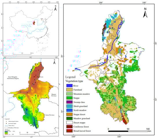 The Ningxia Hui Autonomous Region (35°14–39°23 N, 104°17–107°39 E) is located in the western region of China. The central and northern parts of the territory are irrigated and nourished by the Yellow River, with a total flow of 397 km. Ningxia’s territory is long from north to south and short from east to west, resembling the shape of a cross. The terrain is high in the south and low in the north. The landform is divided into three parts: the Northern Yellow River irrigation area, the central arid zone, and the southern mountainous area, all with an altitude above 1000 m and a total area of about 66,400 km2. The climate type is a typical continental semi-humid and semi-arid climate with strong solar radiation, high evaporation, and poor water resources. The rainfall is scarce with a multi-year average precipitation of approximately 300 mm. The primary vegetation types are coniferous forests and broad-leaved forests in the south, desert and grassland in the middle, and farmland in the north (Figure 1). Grassland coverage accounts for 79.5% of the natural vegetation, and forest coverage accounts for 15.8%. Ningxia has unique geographical advantages for ecological safety barriers, such as the Helan Mountains, Liupan Mountains and Luo Mountains.