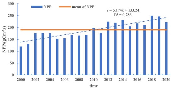 The variation of NPP in the Ningxia terrestrial ecosystem from 2000 to 2020 is shown in Figure 2, and its annual mean fluctuated between 119.98 and 249.66 gC/m2a, with a multi-year mean of 190.15 gC/m2a. The annual average NPP exceeded the multi-year average for 10 years, all of which were after 2010. This indicated that the Ningxia ecological protection and restoration project was effective. The linear trend analysis of the NPP variation value in 21 years showed an annual growth rate of 5.17 gC/m2a, indicating that the NPP showed a fluctuating rise. The ecosystem NPP peaked in 2018 at 249.66 gC/m2a. The minimum value appeared in 2000 at 119.98 gC/m2a. The difference between the highest value and the lowest value was 129.68 gC/m2a.