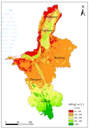 The spatial distribution of the multi-year average NPP value in Ningxia from 2000 to 2020 is shown in Figure 3, with obvious differentiation in characteristics. There are more obvious divergent characteristics, showing distribution characteristics of low in the central and northern sides and high in the southern and northern middle. Vegetation types mainly included: forest land, shrub grassland, mountain meadows, meadow grassland, desert steppe, and farmland. The vegetation NPP ranges primarily between 200 and 300 gC/m2a. The Liupan Mountains and Nanhua Mountains have high altitudes and abundant precipitation with rich forest resources. The vegetation NPP was higher than 400 gC/m2a. Thus, the vegetation NPP level in southern Guyuan City is 77.17% higher than the multi-year average level of the whole region. The central part of Ningxia is an arid zone, the central and southern parts are steppe grasslands, and the central and northern parts are desert steppes. The vegetation NPP ranges mainly between 100 and 200 gC/m2a. The steppe desert vegetation in the piedmont plain of the Helan Mountains on both sides of the north and the edge of the Ordos platform have low vegetation coverage and the lowest vegetation NPP (>100 gC/m2a). The northern Yellow River is nourished by Yellow River irrigation, and a modern agricultural system was formed. The NPP of vegetation is slightly higher than on both sides, at 200–400 gC/m2a. The multi-year average vegetation NPP of each city in Ningxia is: Guyuan City (336.89 gC/m2a) > Yinchuan City (167.75 gC/m2a) > Zhongwei City (159.85 gC/m2a) > Wuzhong City (153.31 gC/m2a) > Shizuishan City (144.46 gC/m2a).