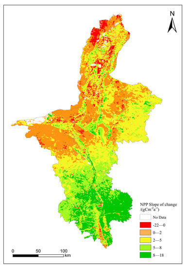 The annual average vegetation NPP interannual variation value slope from 2000 to 2020 in Ningxia was between −21 and 18 gC/m2a (Figure 4). The NPP area with an increasing trend (slope > 0) accounted for 93.78% of the area. The NPP area with a decreasing trend (slope < 0) accounted for 4.22% and was partially concentrated in a shrub grassland zone in the Helan Mountains and the northern Yellow River irrigation area and was sporadically distributed in the desert steppe zone in central Ningxia. The interannual spatial variation of the region gradually increased from north to south. The interannual variation value of the desert steppe in the central and northern parts of Ningxia was between 0 and 2 gC/m2a, accounting for 28.63% of total area in the region. The interannual variation value of the steppe in the northern Yellow River irrigation area and the central and southern regions was between 2 and 6 gC/m2a, accounting for 32.87% of the area of the region. The interannual variation value of the forest grassland zone in the south was 6–18 gC/m2a, accounting for 32.28% of the area of the region. Overall, the interannual variation value of vegetation NPP in Ningxia was 4.89 gC/m2a, showing an increasing trend over the past 21 years.