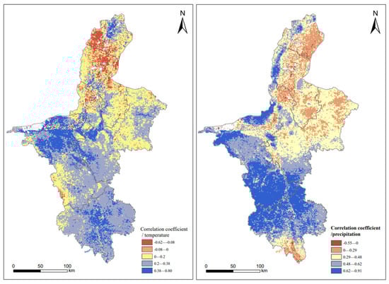 Spatial distribution of correlation coefficients between vegetation NPP and temperature and precipitation in Ningxia from 2000 to 2020.