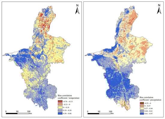 The degree of correlation between the two factors (NPP and air temperature; NPP and precipitation) is expressed by introducing the bias correlation coefficient, i.e., the interference of precipitation (air temperature) needs to be excluded when studying the effect of air temperature (precipitation) on NPP, and the bias correlation coefficient is calculated as follows [29]: