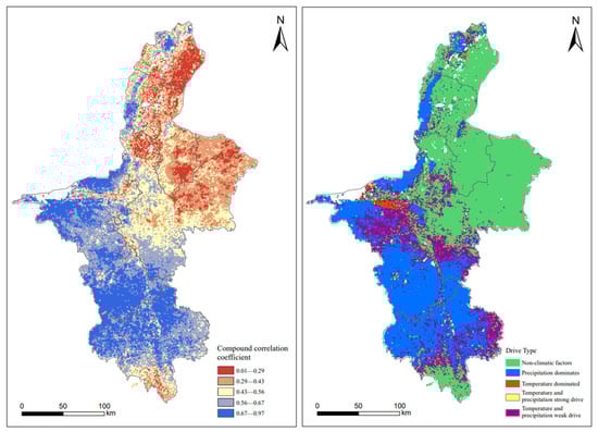 Combining the results of the bias correlation coefficient (α = 0.01) and the significance test (α = 0.05) of the NPP and climate factor, the driving partition of Ningxia NPP was delineated according to the guidelines of the driving partition of NPP and the driving factor [31] (Table 1).