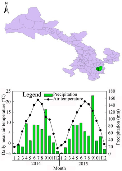 Figure 1. Research site location and seasonal changes in mean air temperature and precipitation from January 2014 to December 2015.