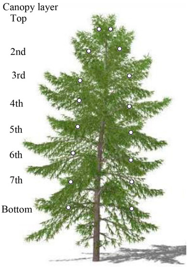 Significant differences exist in the spatial distribution of light within the canopy [13,14]. The light environment within forests is therefore highly different from that of crop canopies where canopy structure or leaf material is more homogenous and not so cone-shaped [15,16,17]. The relative light intensity in the canopy in young forest stands does not decrease steadily from top to bottom. It is worth highlighting here that this is because there is no full canopy closure and thus the spacing between neighboring trees permits light to enter directly from different angles, not just top-down. A local light intensity peak was found near the middle canopy of old Douglas fir trees; the light intensity in the canopy increased because of the lateral penetration of diffused light [8,13,14]. The forest light energy utilization rate was affected by forest canopy spatial distribution [15].