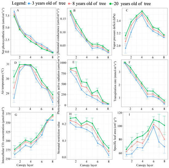 The results highlighted the changes in canopy leaf area and photosynthesis characteristics in the canopy. With an increase in the canopy layer, the net photosynthetic rate, PAR, stomatal conductance (gs), and transpiration rate showed an exponential change, and the VPD and temperature exhibited a univariate quadratic curve change regulation (Figure 3). The VPD and air temperature were maximum in the third and fourth canopy layers, respectively. With an increase in the canopy layer, the intercellular CO2 concentration and specific leaf area decreased linearly and the stomatal limit value increased. There is not much difference among different ages in the overall pattern.