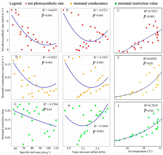 Figure 4. The relationship between net photosynthetic rate (Pn) and specific leaf area (SLA), vapor pressure deficit (VPD), and air temperature (Ta) (AC); the relationship between stomatal conductance (gs) and SLA, VPD, and Ta (DF); the relationship between stomatal restriction value (Ls) and SLA, VPD, and Ta (GI). The red dot is net photosynthetic rate (Pn), orange dot is stomatal conductance (gs), and green dot is stomatal restriction value (Ls), respectively.