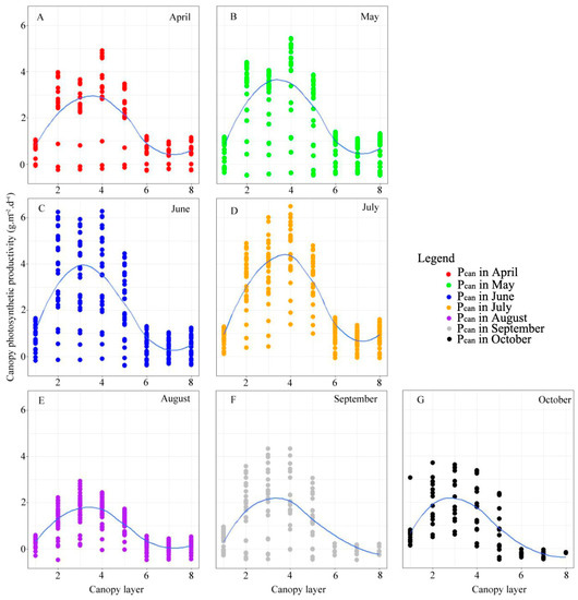 The findings indicated a pattern in canopy photosynthetic productivity concerning height. As the canopy height increased, productivity initially rose, reaching its peak in the third or fourth layer of the canopy. Subsequently, it declined, reaching its lowest point in the seventh layer. However, there was a slight increase in productivity again in the eighth layer (Figure 5). In April, May, and June, canopy photosynthetic productivity was the highest in the fourth layer, followed by the second and third layers. In July and September, it was in the following order: fourth > third > second. In October, it was in the following order: second > third > fourth and seventh > eighth. Furthermore, canopy photosynthetic productivity was highest in June and July, and lowest in August.