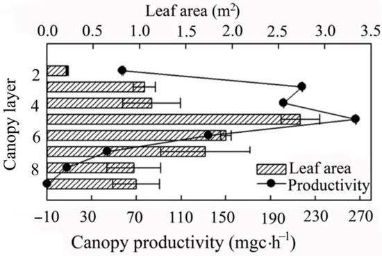 The total leaf area and photosynthetic productivity of the canopy were 10.7 m2, and 919.6 mg C·h−1, respectively (Figure 6). The leaf area first increased and then decreased as height in the canopy increased. It reached a maximum value at a height in the canopy from 48% to 59% (approximately 2.74 m2), accounting for 25.6% of the whole canopy. Photosynthesis productivity reached a maximum at the same depth (about 266.5 mg C·h−1 (28.9%)). When the height in the canopy was 59–69%, the leaf area was 18.1%, and the photosynthesis productivity was 14.6% of the canopy.