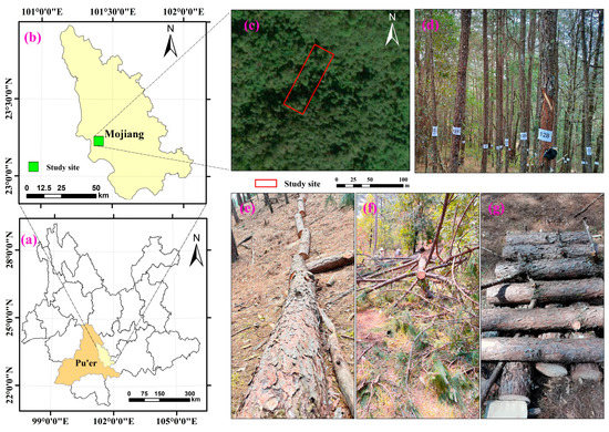 Location of the clear-cutting plot. (a,b) shows the location of the plot in Mujiang county for Pu’er City, Yunnan Province, and (c) is a satellite image of the study site (Red frame); (d) shows the numbering of trees in the sample plot before logging, and (e–g) the trees that were logged.