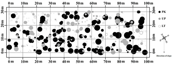 Location of the trees in the clear-cutting plot. PK is Pinus kesiya var. langbianensis, UP is the other trees at the upper layer, and LT is the other trees at the lower layer. The circle diameter is proportional to the tree DBH.