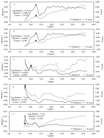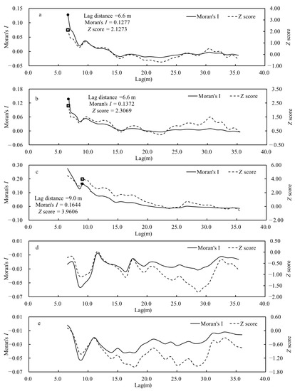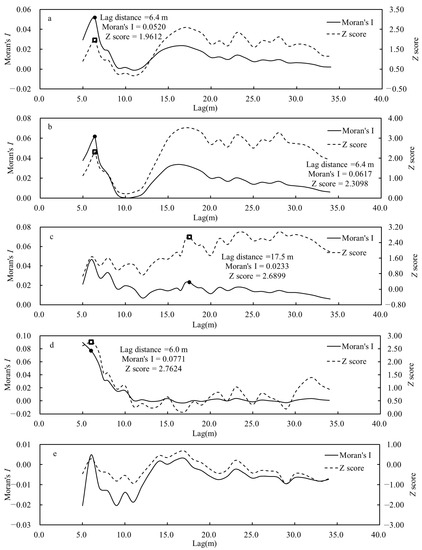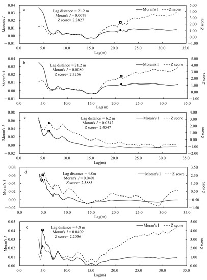 On the contrary, they tend to be dissimilar when the coefficient is negative. If Moran’s I index is close to or equal to 0, the observations are spatially random and independent. So, Moran’s I was chosen to describe the spatial autocorrelation for each component biomass (Equation (2)).