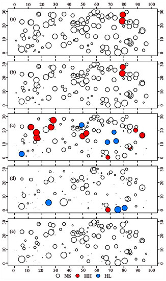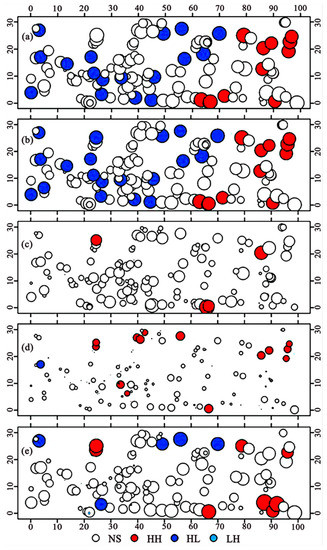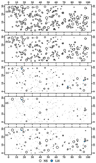 Spatial distribution of local Moran’s Ii for lower trees. The capital letters of the figure codes represent the different components (a) for aboveground biomass, (b) wood biomass, (c) bark biomass, (d) foliage biomass, and for (e) branches biomass. NS is the point of no significant spatial autocorrelation, and LH is the dissimilarity aggregation point with a low-high outlier.