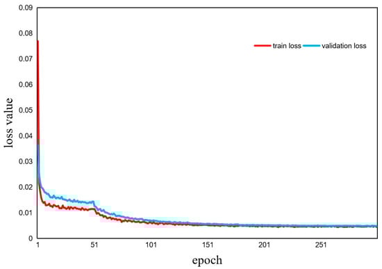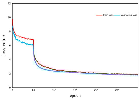 After replacing the backbone network with MobileNetV2, the mIoU is reduced by 0.17%, the mPA is improved by 2.02%, the computation and parameter amounts are both reduced by 94.91%, and the detection speed is significantly improved to 88.03 FPS. After replacing the 3 × 3 convolution with ODConv on the basis of the previous modification, the mIoU and mPA are improved by 1.02% and 0.99%, respectively, and the computation and parameter amounts are further reduced by 0.945 G and 0.555 M, respectively, with a slight decrease in detection speed to 84.90 FPS. The final improved PSP-net improves the mIoU and mPA by 0.85% and 3.01%, respectively, compared with the original model, and the computation and parameter amounts are decreased by 95.71% and 96.10%, respectively. The loss curve during training of the improved PSP-net (Model (c)) is shown in Figure 8; the model reaches convergence after approximately the 150th epoch.