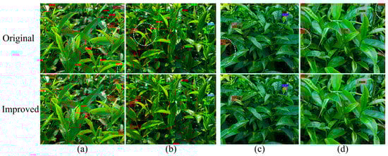 The actual detection effects of YOLOX-tiny and its improved model are shown in Figure 10. The images under two lighting conditions, i.e., strong light and weak light, are compared. For the images of Group (a) and Group (b) under strong light, the original model misses one Class “1” target, respectively, in both groups, as both targets are partially obscured and the shape of the tea bud is not fully displayed, resulting in the original model failing to identify them. However, the improved model accurately recognizes the two Class “1” targets on the premise of accurately recognizing other targets in the images. For the images of Group (c) and Group (d) under weak light, there are one and two FP results, respectively, falsely detected by the original model, that is, old leaves are misjudged as tea buds. All three FP targets are at the edge of the image, with only part of leaf or tea stem inside the image, showing the trait of one bud with one leaf, so they are all identified as Class “1” targets. The improved model accurately identifies all TP results in the images and correctly eliminates these three FP results. According to the actual detection effects, it can be seen that the improved YOLOX-tiny model outperforms the original model under both strong and weak light conditions, with no significant influence caused by lighting conditions on its detection effects. The improved YOLOX-tiny model is not only able to accurately identify tea buds that are partially obscured, but also the backgrounds that are incorrectly identified as tea buds by the original model, and the improved model is able to accurately identify and reject similar false detection results. In summary, the improved model can accurately identify and correctly classify the tea buds in the images, with low missed and false detection rate, high recognition rate and recall rate. The excellent detection capability of the improved YOLOX-tiny can meet the requirements for tea bud target detection in this study.