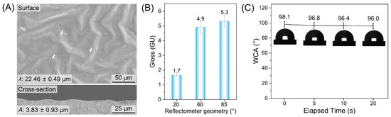 The surface and cross-sectional SEM images of the UV-WPUA coating film are presented in Figure 6. It can be seen from Figure 6A that the presence of disordered wrinkles on the film’s surface. The wrinkles on the film have a λ of 22.46 μm and an A of 3.83 μm, which are lower than those on the surface of F0.5–120 (λ: 25.71 μm, A: 3.93 uμm). We speculate that the slight influence of additives and water used during the coating preparation process may affect the wrinkles’ dimension. The gloss value is presented in Figure 6B, which demonstrates the gloss values at 20°, 60°, and 85° geometries are 1.7 GU, 4.9 GU, and 5.3 GU, respectively. The gloss values obtained at 60° geometry indicate that the cured coating film is the low-gloss film, which meets the criteria of extinction classification [53]. The gloss value is lower than that of F0.5–120, possibly due to the SiO2 added as a filler in the coating preparation process, which remains on the film’s surface after UV curing, thereby decreasing the gloss value (as shown by the white arrow) [54]. Figure 6C shows the WCA-elapsed time curve of UV-WPUA coating film, indicating an initial contact angle of 98.1°, followed by 96.8°, 96.4°, and 96.0° at 5 s, 10 s, and 20 s, respectively. These results suggest that the cured coating film exhibits a hydrophobic surface, which is related to its surface wrinkles structure [50,55].