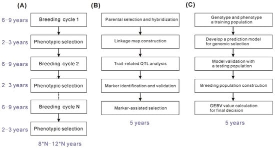 Basic procedures and time costing of breeding processes for Eucalyptus species: (A) conventional phenotype-based breeding; (B) marker-assisted selection; and (C) genomic selection.