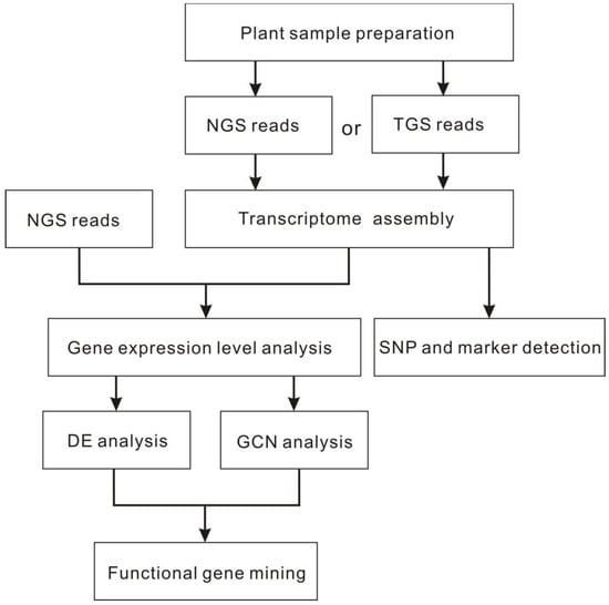The gene expression data can also be used to construct the gene co-expression network (GCN), a powerful tool for the further elucidation of the gene regulatory relationships and identification of candidate functional genes [104]. The weighted gene co-expression network analysis (WGCNA) is a widely used pipeline to construct the GCN by clustering genes into modules based on their expression patterns and hub genes within each module [105]. The gene co-expression analysis has been successfully applied in detecting key functional genes regulating various biological processes in forest plant species, such as Pinus tabuliformis [106], Populus trichocarpa [107], Hevea brasiliensis [108], and Zanthoxylum armatum [109]. As a result, the cross-species GCN comparison effectively deduces the origin of new phenotypes and conserved gene functions at the species level [110]. Although this approach is rarely applied in forest plants, it has great potential in mining hub genes encoding important traits of forest plants. Moreover, transcriptome sequence and RNA-seq data are also applied in the genome-wide detection of SNP and simple sequence repeat markers (Figure 3), which are valuable molecular tools in forest plant breeding [111].