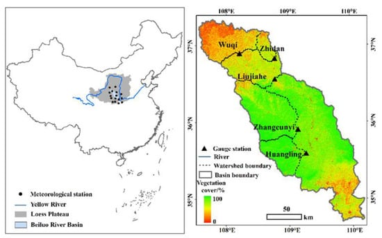 Landsat images with a 30/80-m resolution covering the Beiluo River basin around 1970, 1980, 1990, 2000, 2010, and 2019 were collected from the United States Geological Survey (USGS; https://earthexplorer.usgs.gov/, (accessed on 29 December 2021)). The corresponding vegetation coverage (mixed categories) in each watershed was derived from the NDVI using the dimidiate pixel model [].