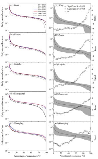 To examine changes in the streamflow regime of the catchments, daily flow duration curves for each decade of records were constructed as shown in Figure 2. A common feature of the FDCs of daily streamflow from LFCs is that they gradually decrease in the high flows (0 to 5th percentiles on the FDC) of the curve, while they gradually increase in the low flows (70th to 100th percentile on the FDC) at different period points, especially in the 2000s and 2010s (Figure 2a1–c1). The FDCs from FCs showed a parallel change characteristic because, when compared with the 1960s and 1970s, the low flow of the FDCs show an increase at different period points (Figure 2d1,e1). As to the Huangling catchment, there is a uniform change in all the percentile flows of FDCs at each period point (Figure 2e1).