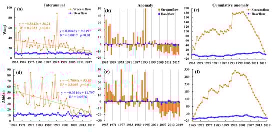 To further understand the variation in hydrological regimes, the BFI method was used to split the total streamflow into stormflow and baseflow, and the trend and variation in annual, seasonal, and monthly streamflow and their components were analyzed based on the Mann–Kendall trend test and the cumulative anomaly method.