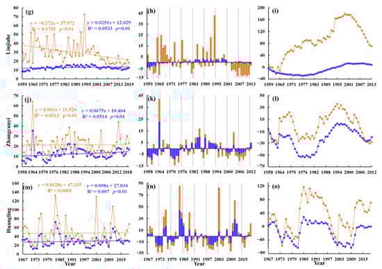 The anomaly value represents the degree of deviation between a data point and the average value of the series within a certain period, including negative anomalies (data greater than the average) and positive anomalies (data less than the average). The cumulative anomaly value is obtained by adding all anomaly values in the series. From the cumulative anomaly curve, the long-term significant evolution trend, continuous change, and change point of streamflow and its components can be intuitively determined []. The calculation formula is as follows: