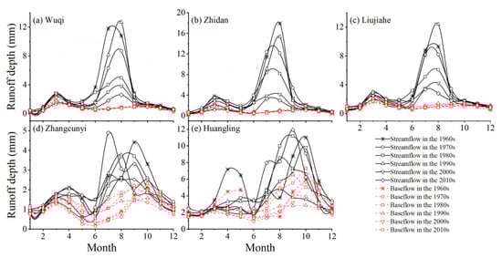 To investigate the variation characteristics of streamflow and its components on the monthly scales, the monthly streamflow and baseflow for each decade of records were constructed as shown in Figure 4. Changes in the LFCs and FCs of the streamflow and its components showed different patterns during the study period. In the LFCs (Figure 4a–c), we observed the streamflow had two peaks: a first one in spring (March) and a second in summer (July to August). Mean monthly baseflow was highest in two months: March and October. The peaks of the streamflow in LFCs decrease during the entire study period, except for in the 1990s, while baseflow presents little change in mean values between each period (Figure 4c). Similar to LFCs, we also observed that the streamflow and baseflow had two peaks: in spring (March and April) and late summer (August) or autumn (September and October) in FCs. However, the peaks for streamflow and baseflow in FCs are gentler than those in LFCs (Figure 4a–e).